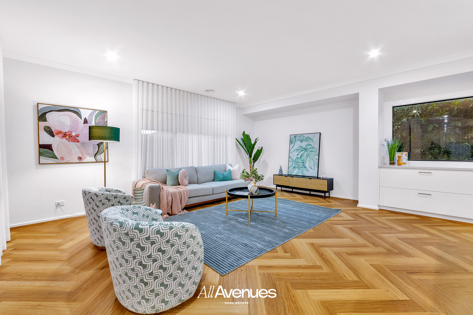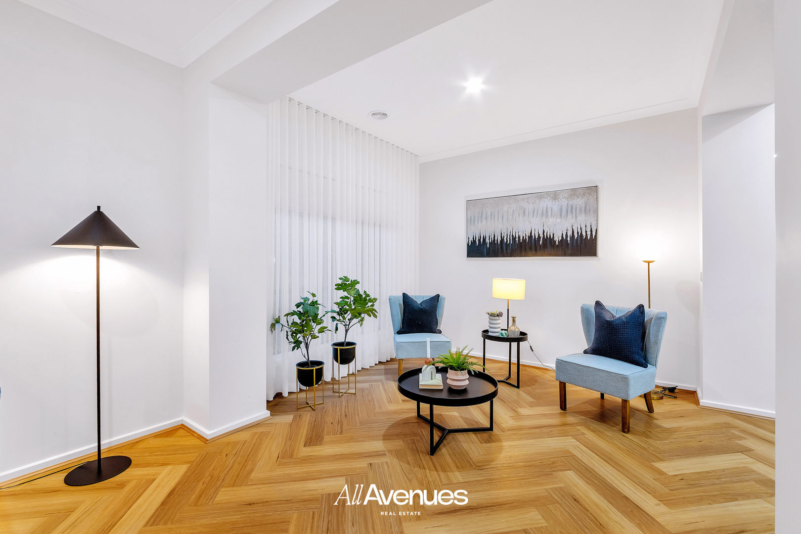 Step through the wide double-door entrance and be greeted by soaring 9-foot ceilings and herringbone hybrid flooring that flows seamlessly throughout. The front guest bedroom features triple built-in robes and a nearby full bathroom – ideal for extended family or guests.