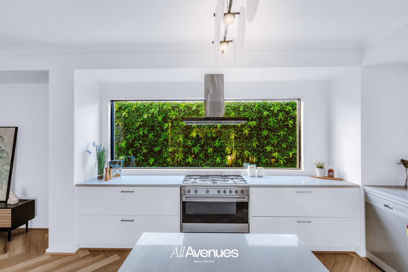 The designer kitchen is a true showpiece – boasting three expansive benchtops, including a 40 mm stone island, herringbone glossy tiled splashback, premium appliances, and a display-style glass window overlooking a lush green-wall fence. A large walk-in pantry completes this entertainer’s dream.