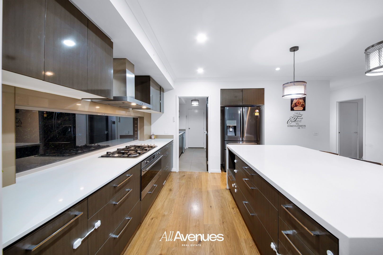 – A modern open plan kitchen with space for fridges, extended stone benchtop, 900mm European cook top and stainless-steel appliances, Wall Pantry & Butler Pantry with lot of Space.