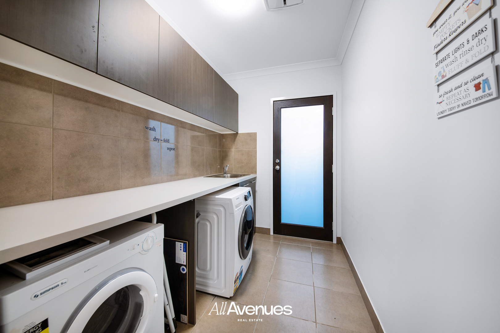 – A laundry with built in space for washer/dryer, overhead storage, and easy access to side space