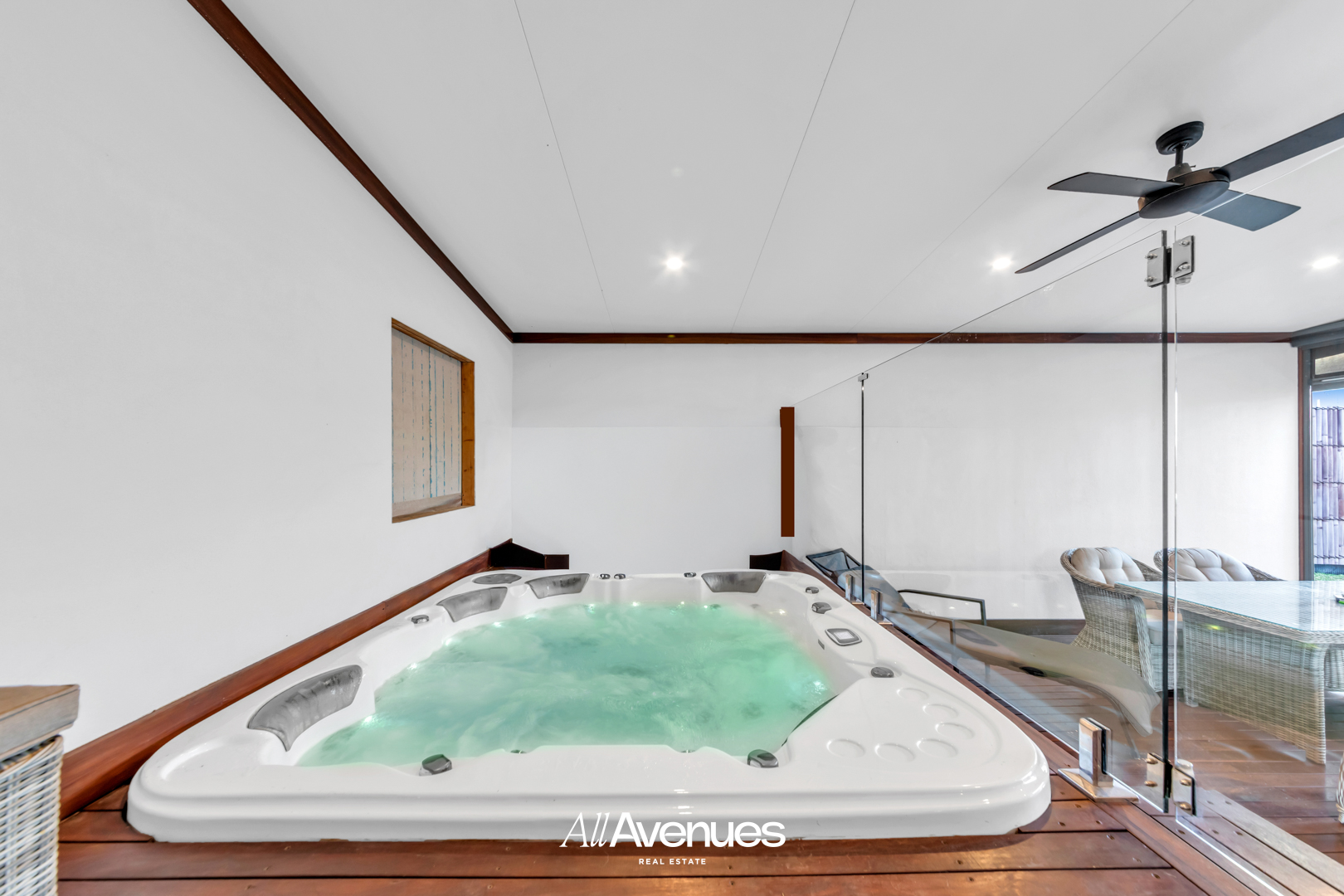 Here, timber decking, a built-in spa with glass balustrade and a tranquil lounge area create the perfect setting for year-round entertaining.