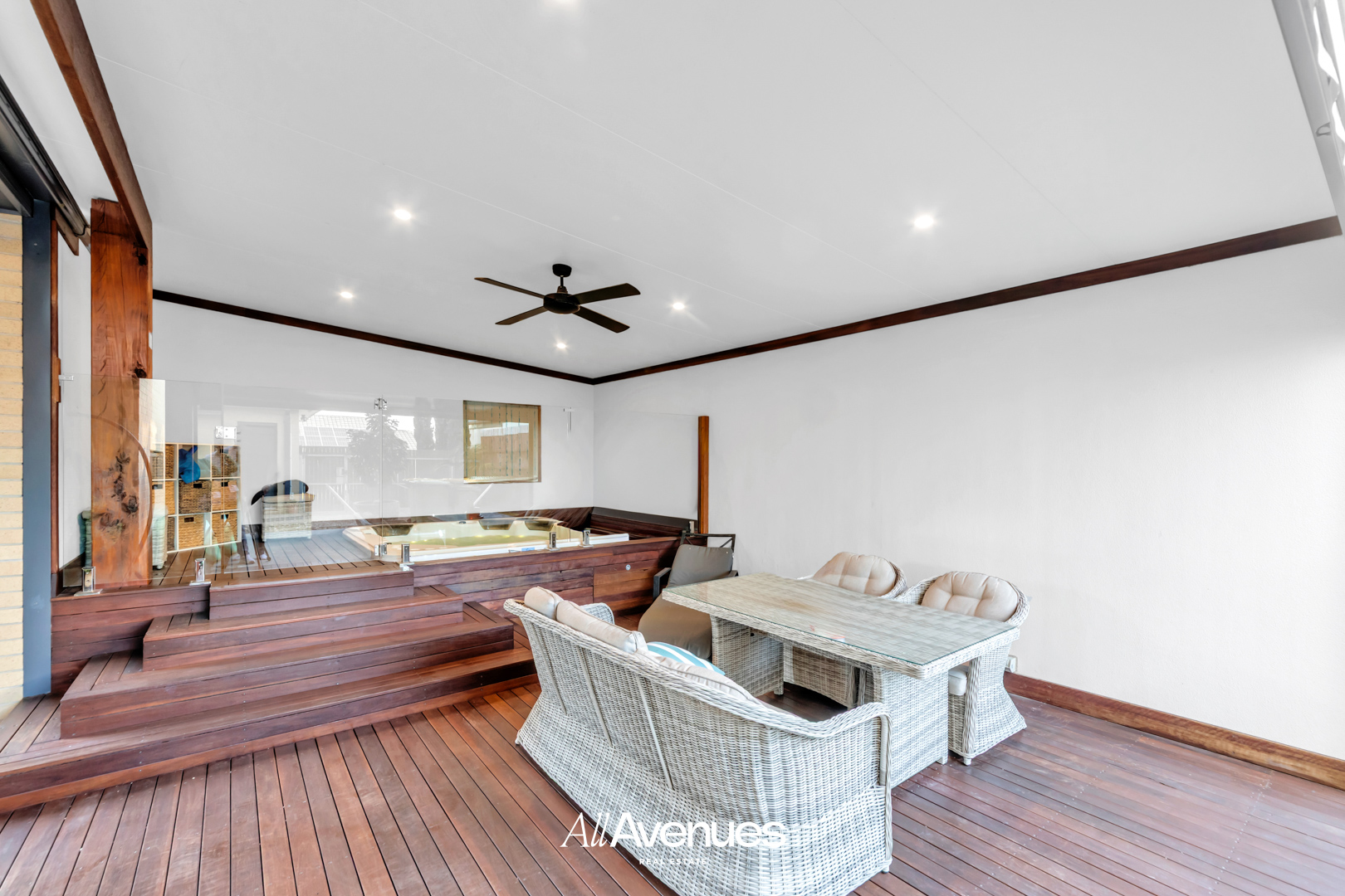 Expansive undercover alfresco with spa & lounge seating
