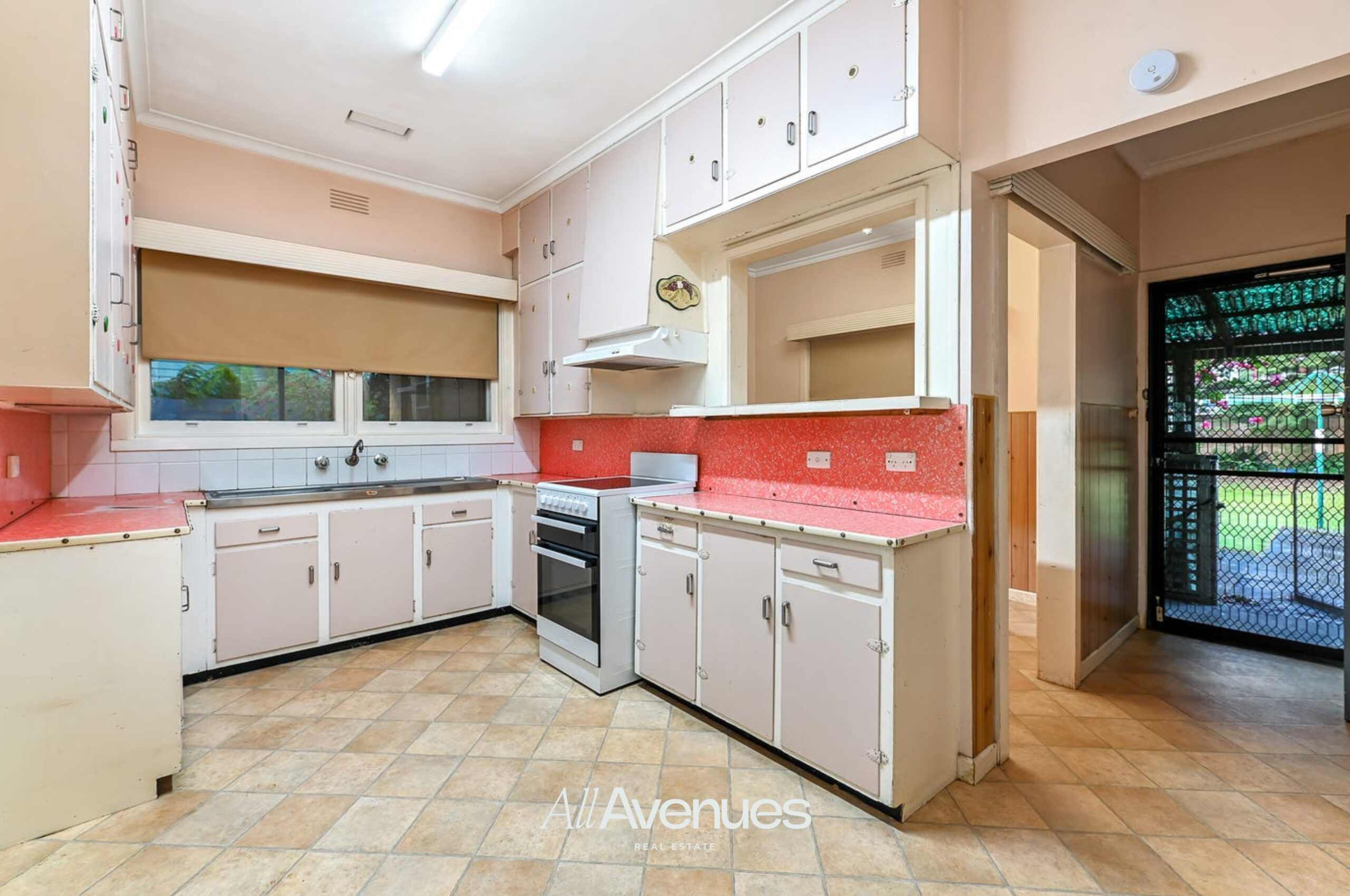 The original laminate kitchen showcases retro tones and ample cabinetry, complete with a freestanding 600mm electric oven, induction cooktop, partially concealed rangehood, and a wide stainless-steel sink with classic spindle tapware.