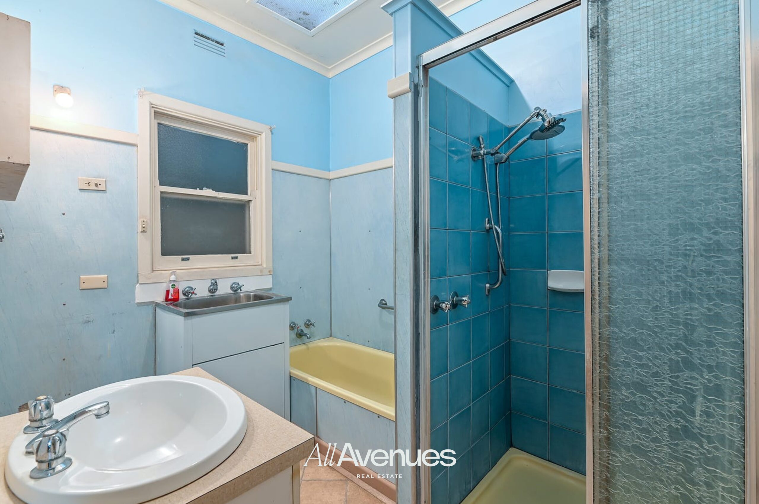 Four well-proportioned bedrooms are thoughtfully positioned throughout the home, offering privacy and flexibility. Two spacious covered alfresco and pergola areas provide shade and additional outdoor living options. The central bathroom continues the nostalgic theme with blue accents and natural light from an overhead skylight.