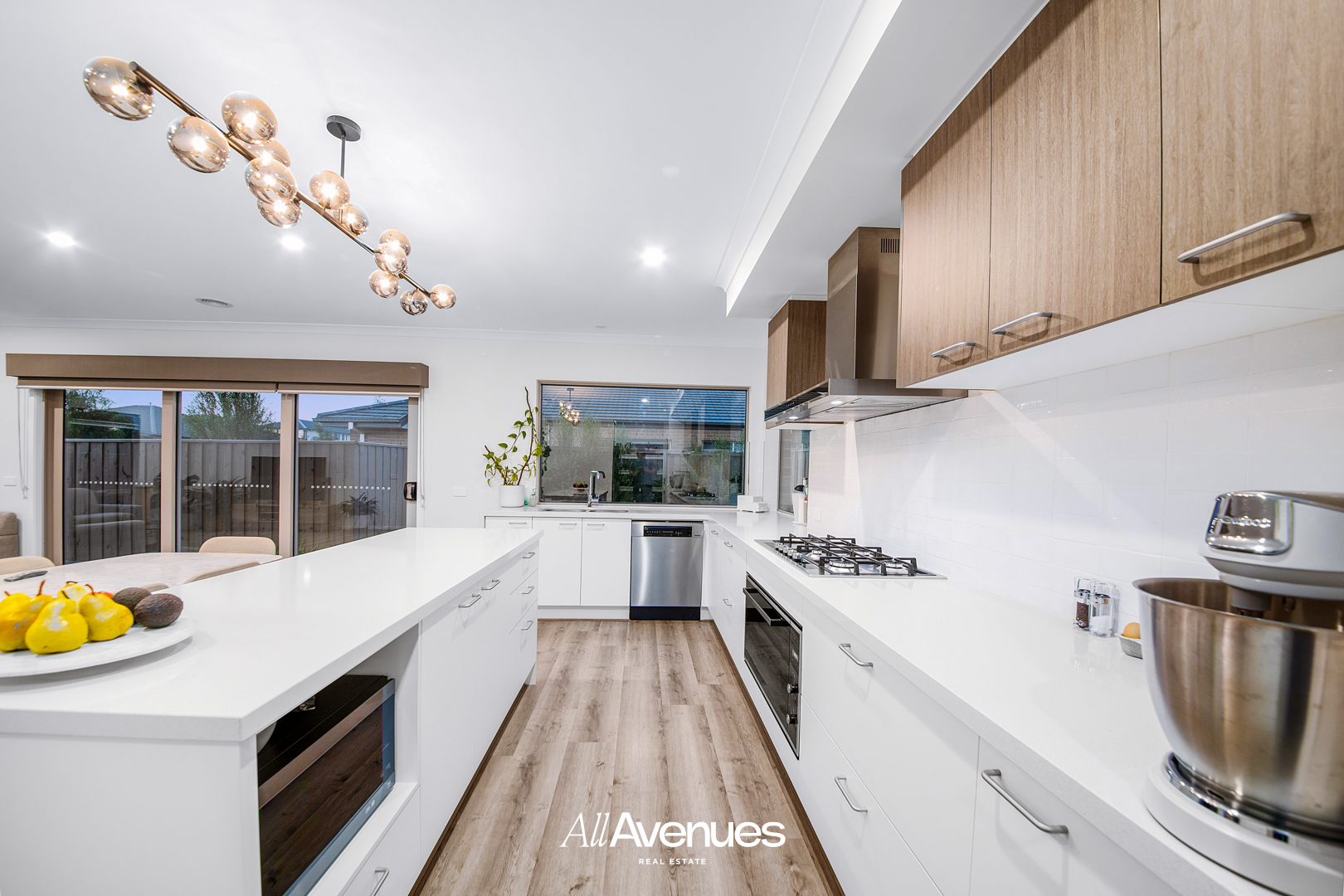 – Open plan Kitchen : A chef’s delight featuring stone island benchtop, 900mm Quality Gas cooktop, oven and meile dishwasher.